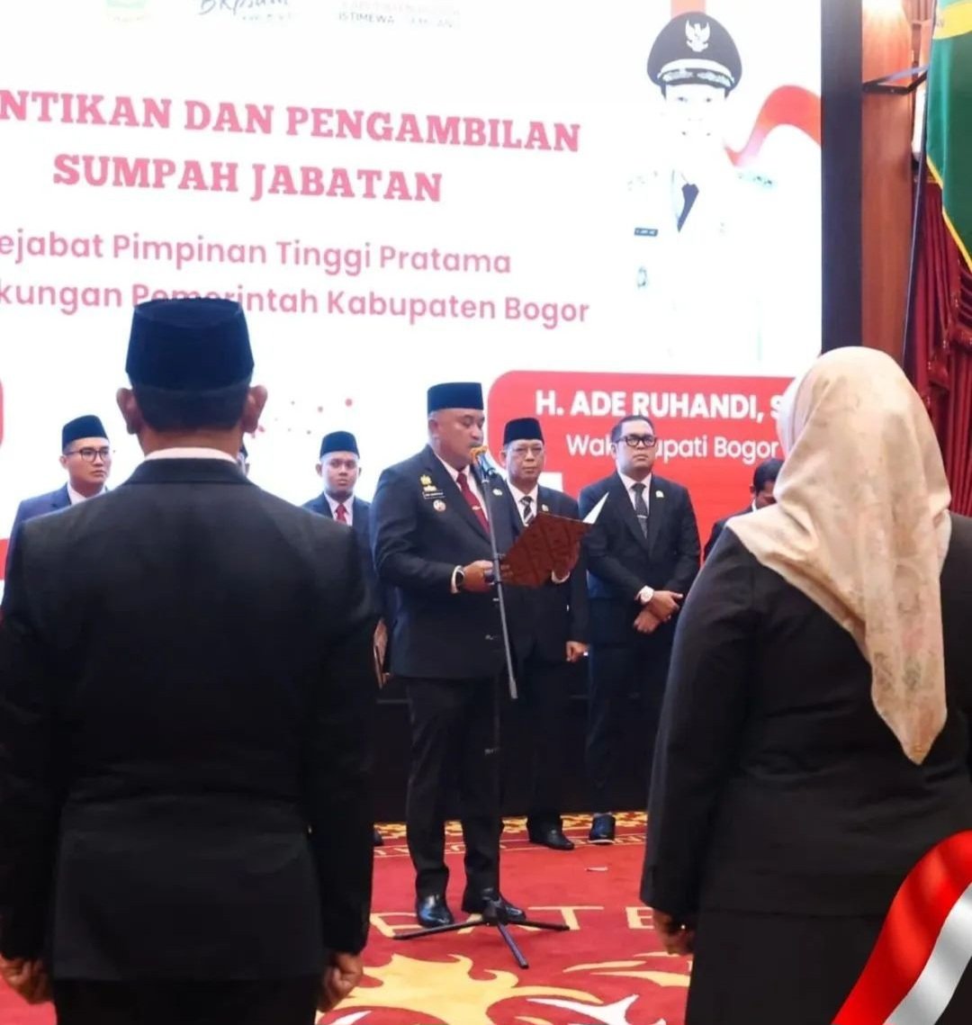 BOGORISTIMEWA.com – Bupati Bogor, Rudy Susmanto, melantik dan mengambil sumpah jabatan tujuh pejabat eselon II di lingkungan Pemerintah Kabupaten (Pemkab) Bogor, yang berlangsung di Pendopo Bupati Bogor, Rabu malam (13/8/25). Pelantikan tersebut dihadiri Wakil Bupati Bogor, Ade Ruhandi, jajaran Forum Komunikasi Pimpinan Daerah (Forkopimda), serta para kepala perangkat daerah.