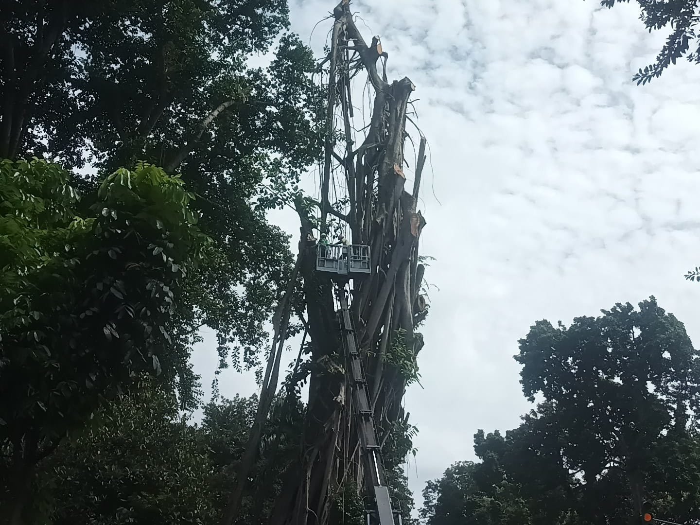 “Pohon ini sangat besar, jadi proses pemangkasan akan dilanjutkan hingga benar-benar tuntas dan tidak membahayakan lagi,” jelasnya.