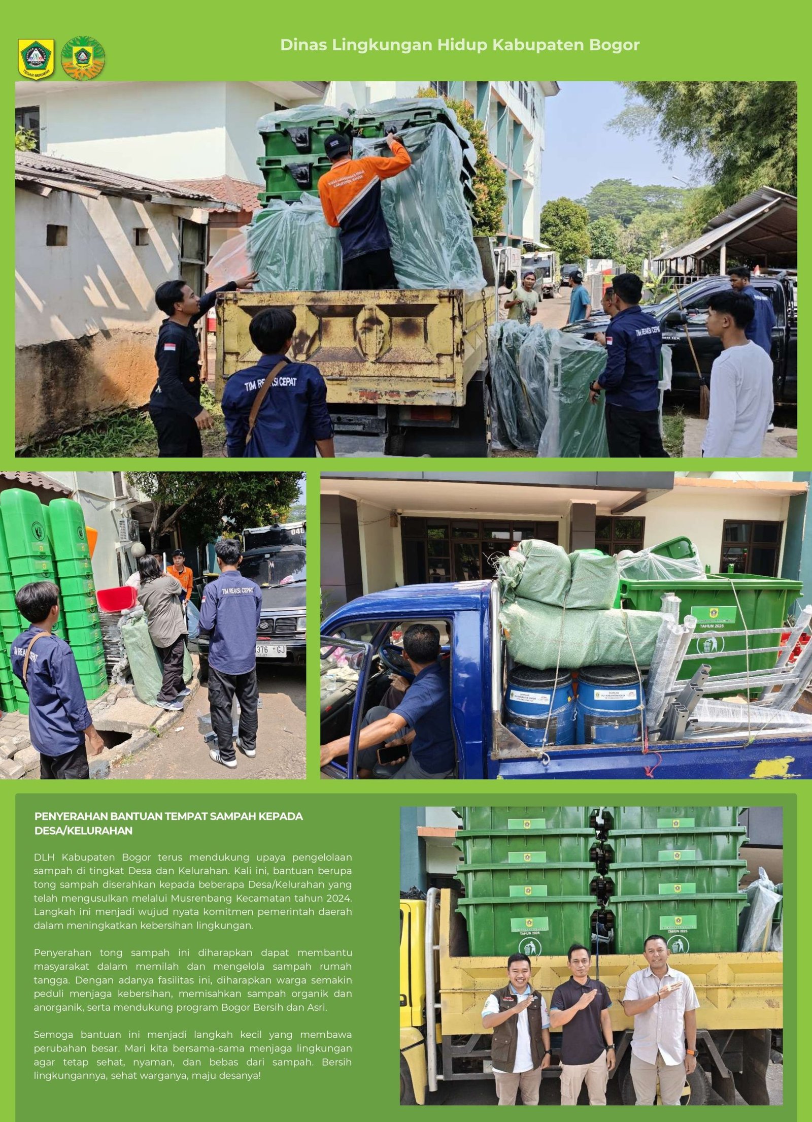 Penyerahan bantuan tempat sampah oleh DLH Kabupaten Bogor kepada Desa/Kelurahan, sebagai wujud dukungan peningkatan pengelolaan sampah di tingkat komunitas.