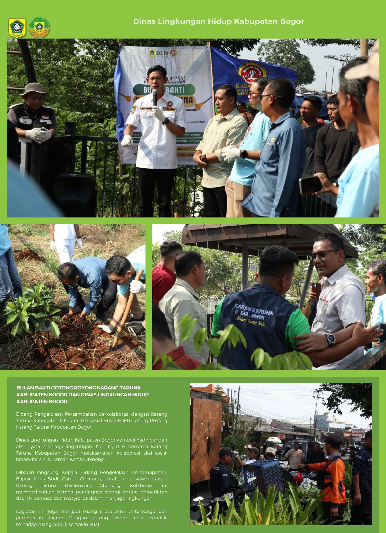 Kegiatan Bulan Bakti Gotong Royong DLH Kabupaten Bogor bersama Karang Taruna di Taman Karta Cibinong,memperkuat sinergi pemerintah dan pemuda dalam aksi nyata menjaga kebersihan lingkungan.