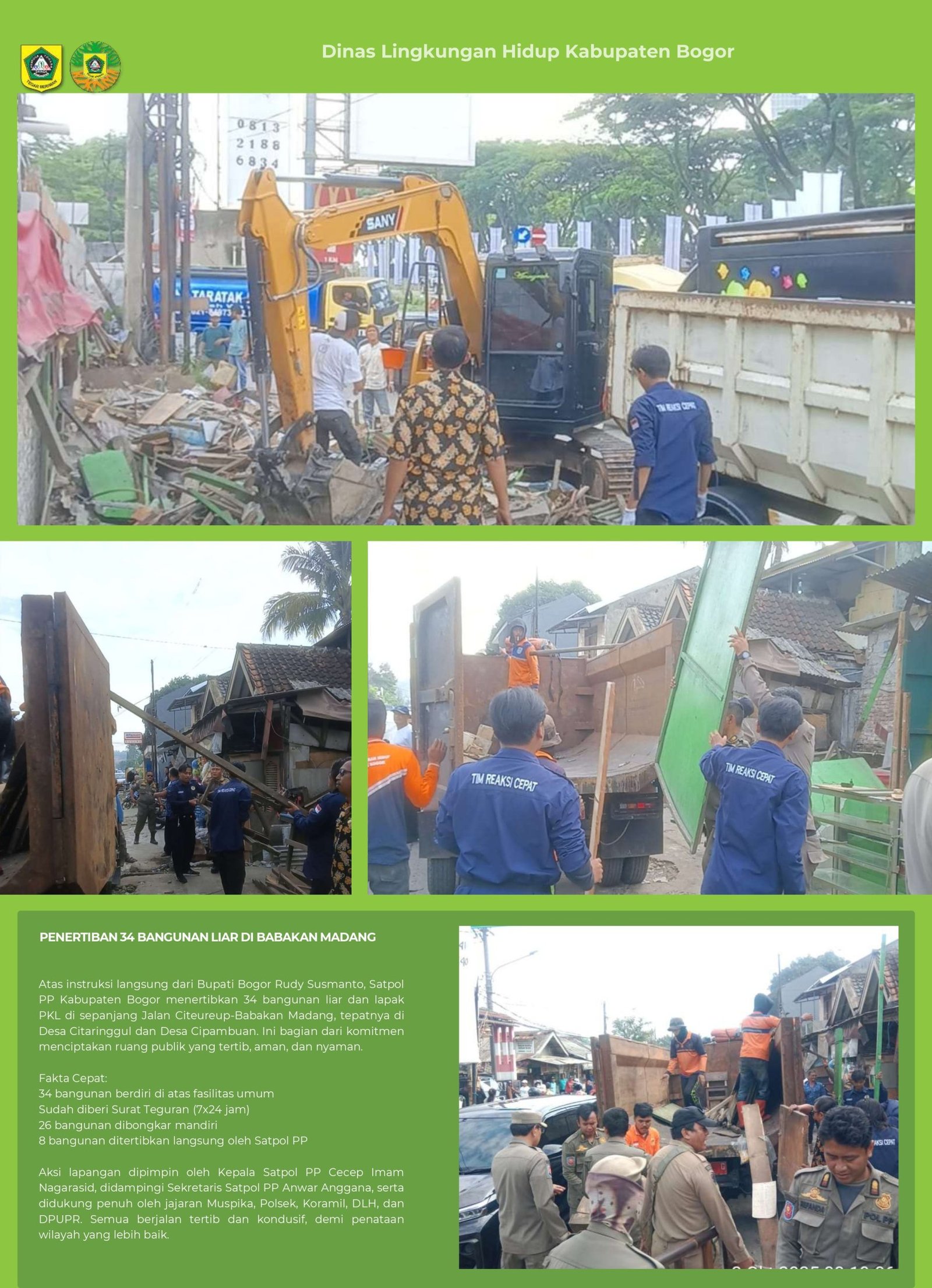 Petugas Satpol PP Kabupaten Bogor melakukan penertiban bangunan liar di sepanjang Jalan Citeureup-Babakan Madang,sebagai bentuk komitmen penataan ruang publik yang tertib dan aman.