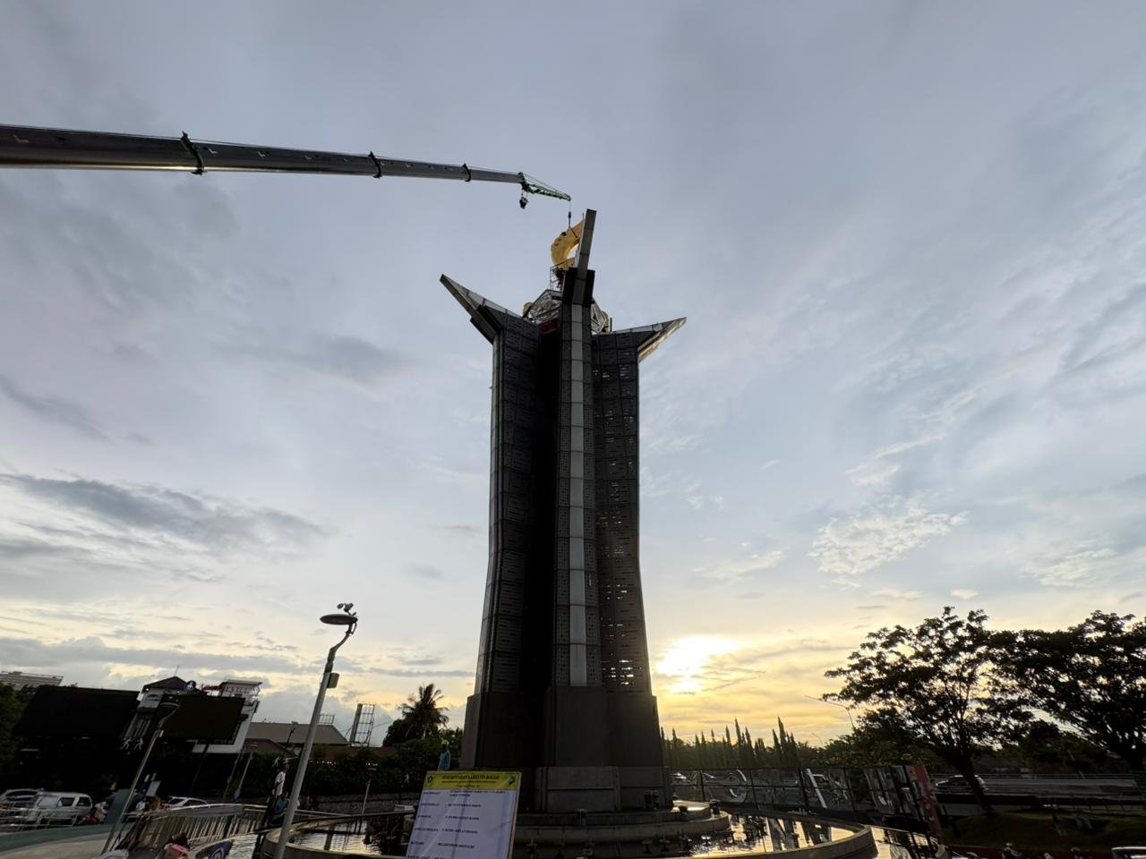 Berdasarkan pantauan di lokasi, kujang yang terbuat dari material kuningan berwarna emas itu terlihat mulai dipasang menggunakan alat berat oleh para pekerja.