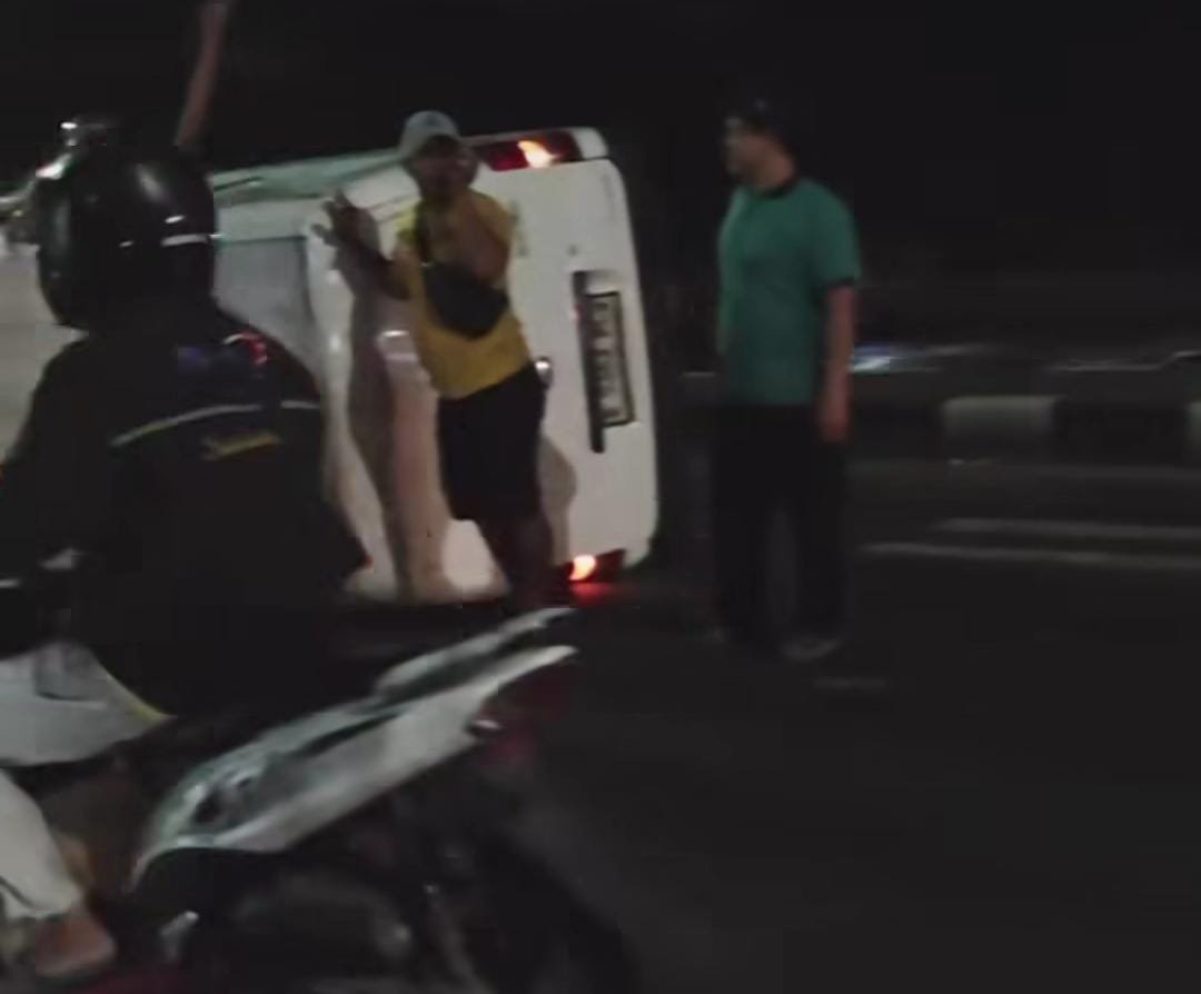 BOGORISTIMEWA.com – Satu unit mobil Daihatsu Grandmax BlindVan bernopol B 9363 POV yang dikendarai pria berinisial R terguling usai menabrak traffic light di Jalan Raya Bogor-Jakarta, tepatnya di Simpang 3 Cikaret, Kampung Curug, Kelurahan Cirimekar, Kecamatan Cibinong, Kabupaten Bogor, Senin, (2/6/25).