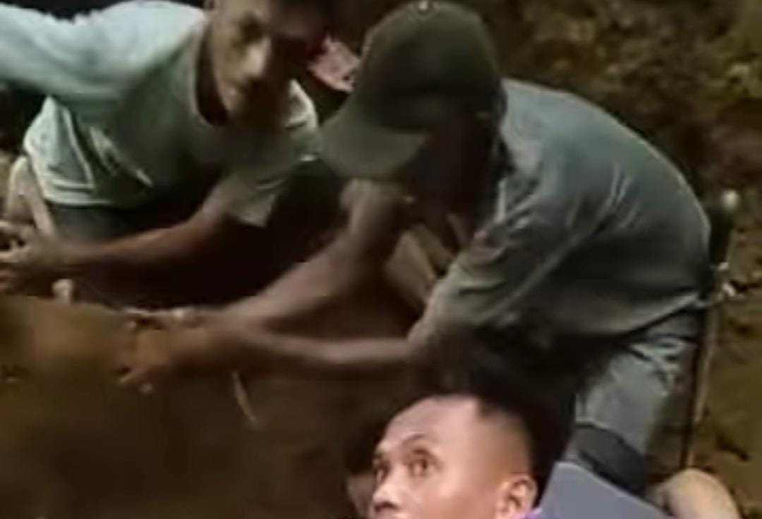 Berdasarkan video yang beredar, sejumlah warga setempat sedang berupaya menggali tanah yang menimbun kuli bangunan saat sedang bekerja.